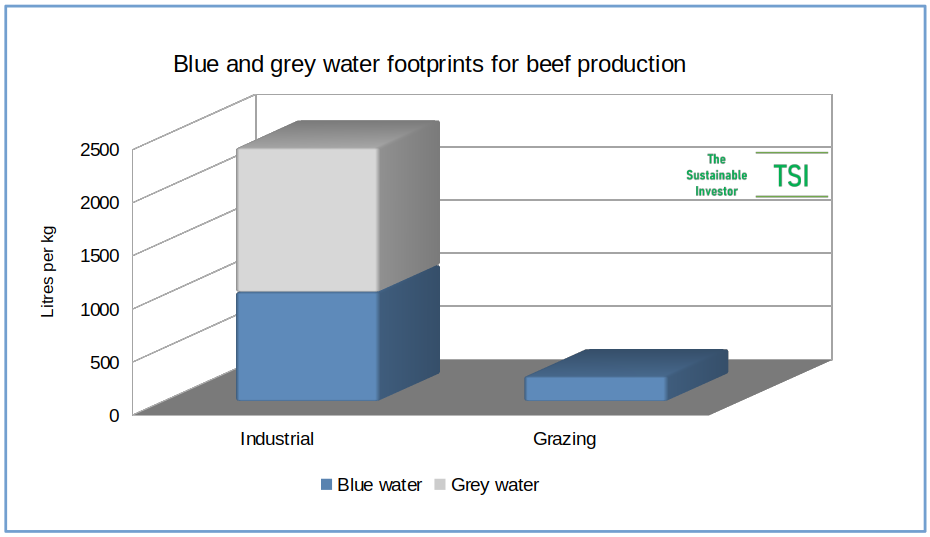 There are also differences between industrial beef production and open grazing. Industrial beef production has ten times the combined blue and grey water footprints of grazing.
