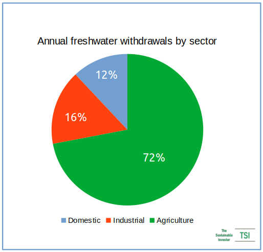 The second major environmental impact is water usage. Agriculture is by far and away the largest user of freshwater.