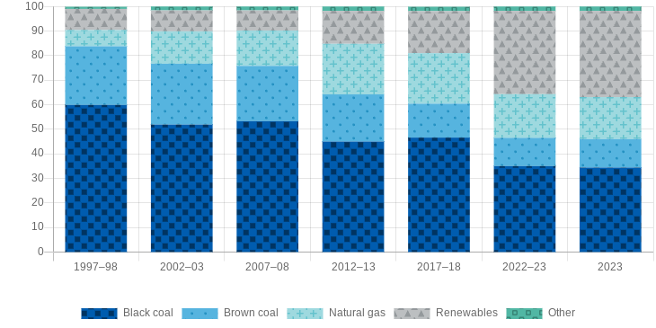 Rooftop solar is not only helping residents and businesses protect themselves against higher electricity bills, it's also helping to reduce the share of coal in the generation mix. And we all know that coal is the first fuel we need to drop out of the system if we are to keep on the path to decarbonise electricity generation. In 2023 it 'only' contributed c. 50% of generation supply, down from over 80% in 1997-98.