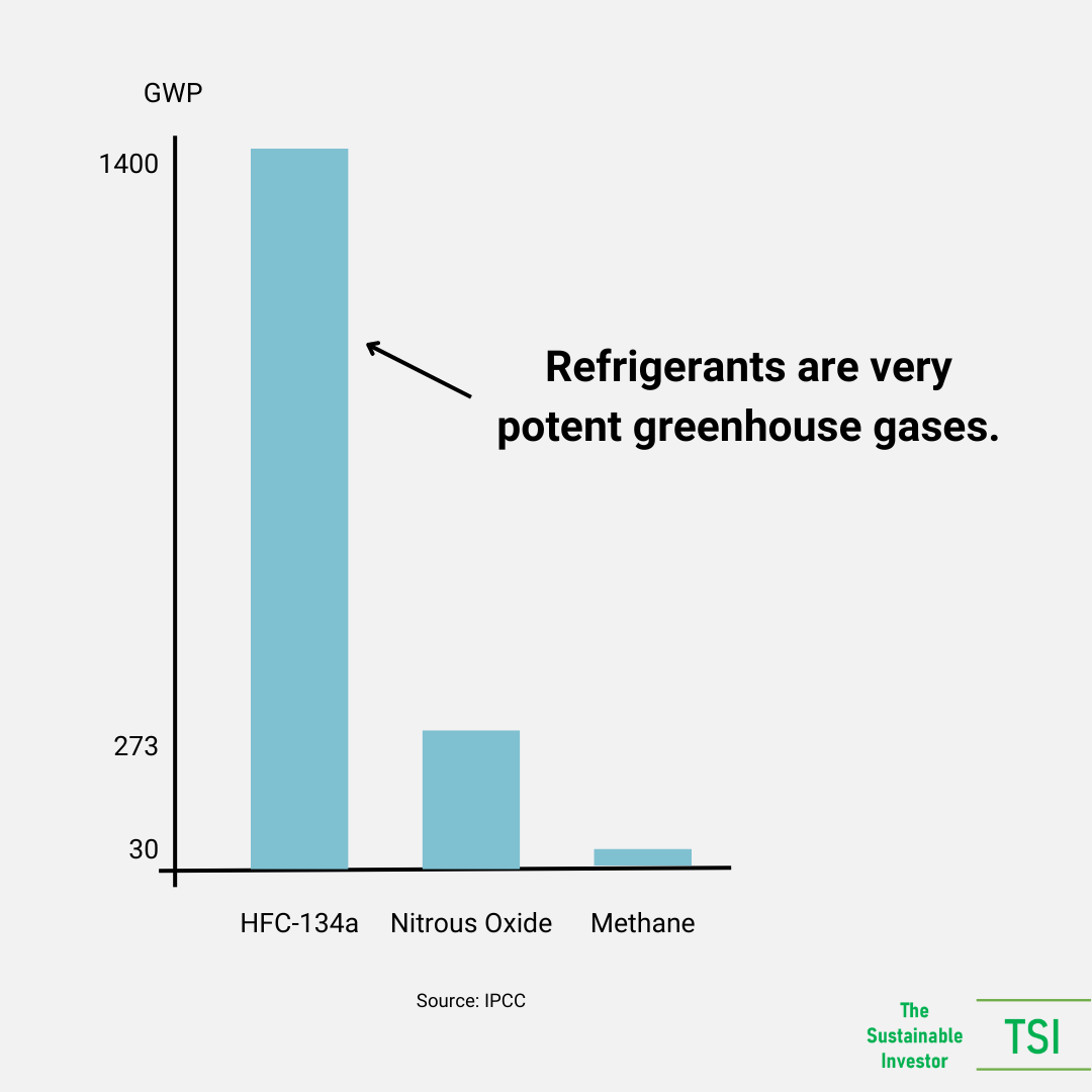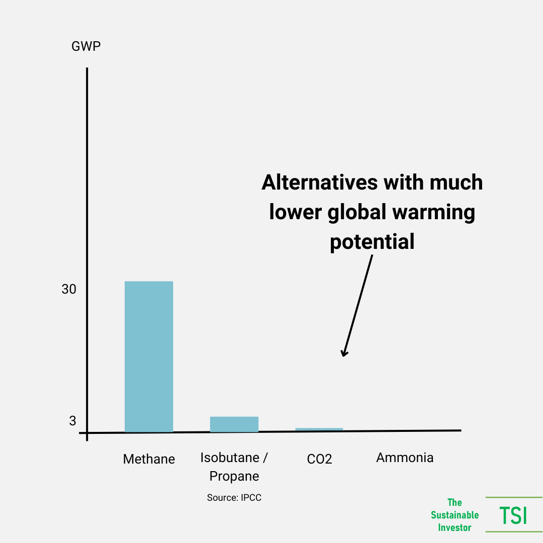 The good news is that there are alternatives with much lower GWP including ammonia, carbon dioxide, propane and isobutane that are increasingly the standard, but something worth checking in an HVAC systems spec: