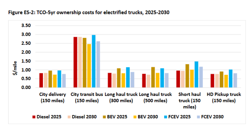 - What does the study show? To simplify, by 2025 “battery electric vehicles are cheaper than fuel cells, and they are close to being competitive across truck types. By 2030, the battery electric trucks will be even cheaper, with a lower TCO in city usage and only slightly higher for long distance usage. Fuel cell vehicles have higher TCO than the comparable battery electric vehicles, but in most cases they are close to that of the diesel vehicles”. In the spirit of a picture is worth a 1,000 words ..... Note that this analysis suggests that Battery Electric Vehicles (BEV) will become the cheapest alternative on a TCO basis by 2030, but not in all use cases.