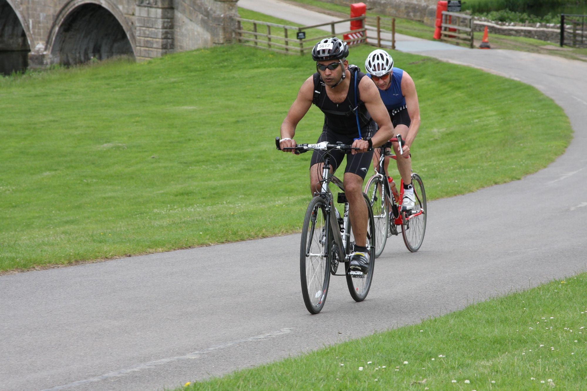Just under nine months later and this was me, competing in the Blenheim Palace Triathlon (sprint distance) with one of my friends. I am on the front bike slightly ahead of him.