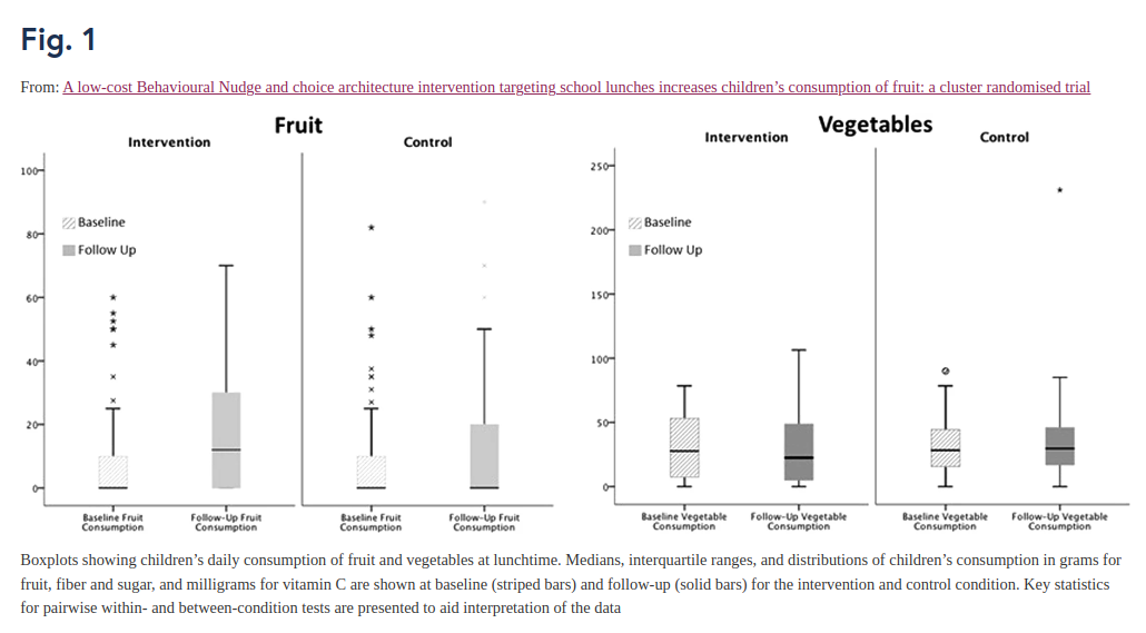 Researchers from Bangor University, Wales, collected data from four primary schools over a two day period on pupil's consumption, in particular that of fruit and vegetables. Then some changes were made to how different kinds of food were presented to the children (in some of the schools), for example improving the positioning and serving of fruit and making the labelling more attractive.