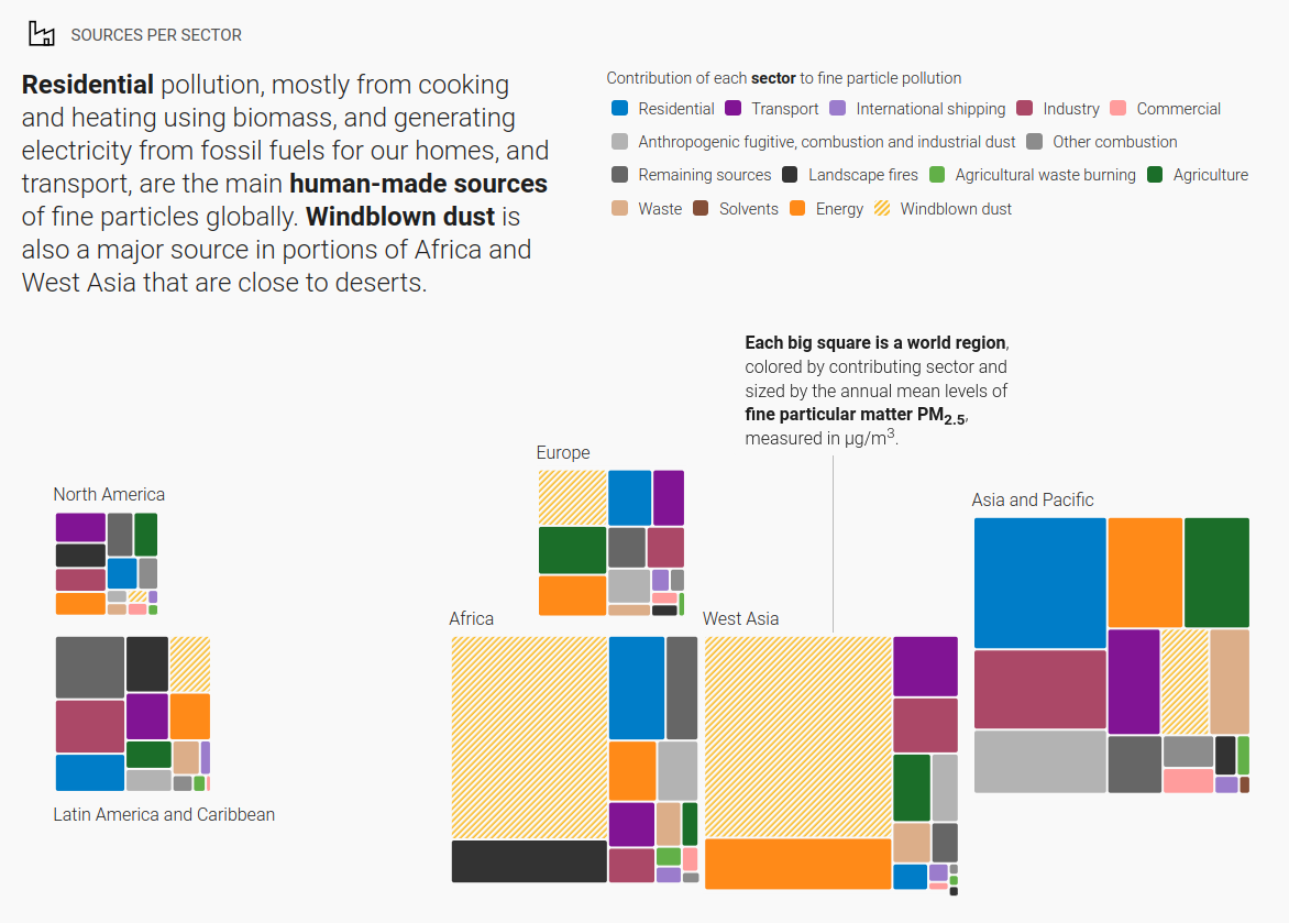 It is worth noting that a proportion of PM2.5 comes from naturally occurring sources such as pollen and sea-spray. In areas such as Africa and West Asia that are close to deserts, windblown dust is a major source. Man-made sources include domestic combustion, industrial processes, manufacturing, construction and road transportation.
