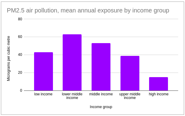 In 2021, the WHO updated their PM2.5 annual mean air quality guideline to five micrograms per cubic metre. The previous 2005 guideline level was 10 mcg / m3. This means that in 2019, 99 percent of the world population was living in places where the WHO’s strictest air quality guideline levels were not met.