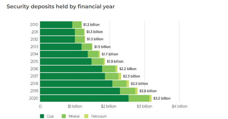 As of Jan 2021 (the latest data we could find) the NSW Government (which covers the Hunter Valley) held about $3.3 billion in security bonds for rehabilitation of exploration and mining impacts. This sounds a lot of money. The security deposit aims to cover the full cost of all rehabilitation and mine closure activities required if a mining company defaults on their rehabilitation obligations. The amount held has risen dramatically over the last decade.