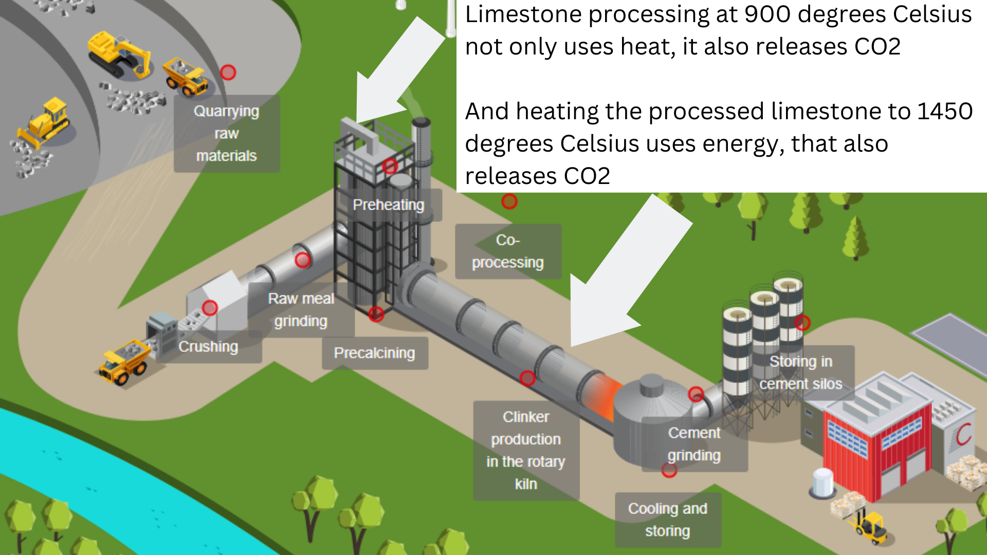 - This gives us a bit of a clue as to why decarbonising cement production is so tough. The first challenge is that the chemical process that releases the CO2 is an inherent part of turning limestone into cement. The production process just doesn't happen without this stage. To reduce these emissions we need to use something else other than limestone as a raw material, which is tough.