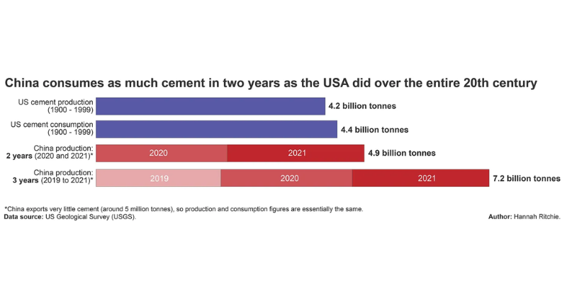 - And one last thing before we move on. Since 1985, China has become the largest producer of cement and they consumed more cement in 2 years (2020 to 2021) than the U.S. consumed in the entire 20th century. In 2018, China’s cement production accounted for ~56% of global cement production. This is all from fact checker extraordinaire Hannah Richie.