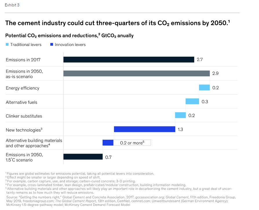 - It's important to be clear, there isn't a single simple silver bullet to this challenge. And unlike say Oil & Gas, its hard to see a future where we don't continue to use a lot of concrete, and hence cement. So how does the jigsaw fit together. Back in 2020 McKinsey is a study, looking at the potential contribution of the various solutions they had identified.