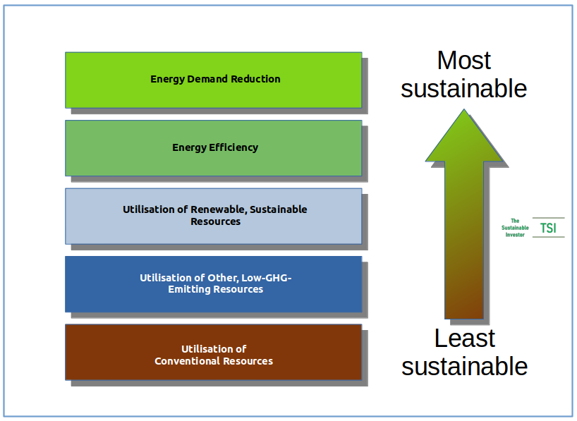 The Institute of Mechanical Engineers published an 'Energy hierarchy' in 2009 to act as a framework to guide sustainable energy policy and decision-making. We have represented it graphically below.