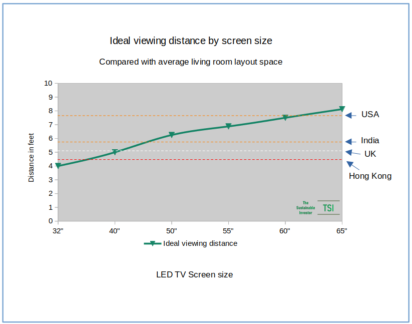 Several sources have reported that 1.5x the screen size is the optimal distance for positioning a flat screen HD TV away from the viewer. In countries where living space is relatively small, for example in a Hong Kong apartment, there is little room to position a very large TV so the viewer enjoys the optimal viewing distance. This becomes less relevant in countries where living spaces are generally larger, such as the US.