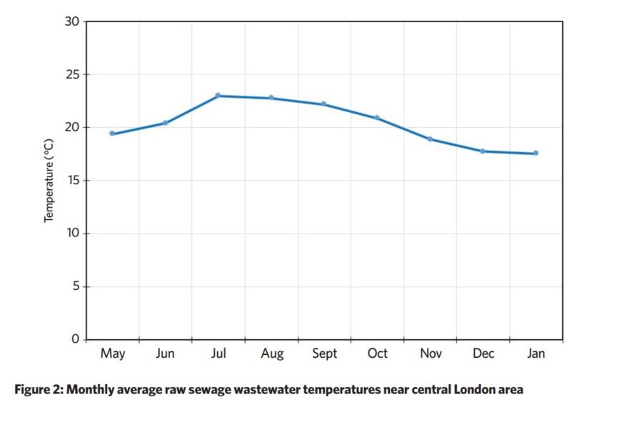 - Lets start today with heat. Most wastewater outflows are warmer than the rivers into which they flow. Temperatures at the input side range between 18 degrees and 23 degrees C, depending on the season. And by the time it is processed and ready to pump into the river or sea, a typical temperature is 12 - 15 degrees C, and they hold this temperature pretty much all year round.