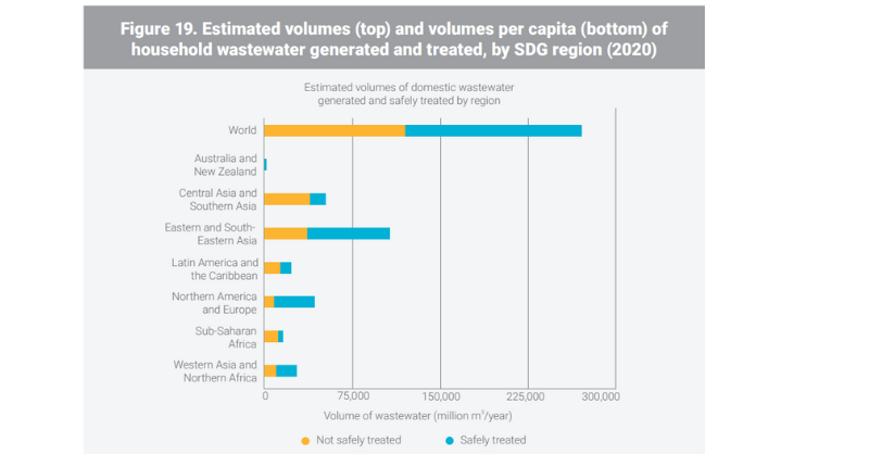 - Wastewater treatment is actually two issues, not one. The first and obvious one is where wastewater is not treated at all before its 'outflowed' into rivers, lakes and the sea. In their 2021 update, UN Water estimated that globally nearly half of household water flows were NOT safely treated. And the data shows massive variations, with the lowest levels of treatment in Central and Southern Asia & Sub Saharan Africa.