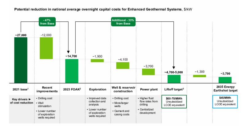 The biggest constraint on exploiting the geothermal potential is the up front capital cost. It is estimated that in 2021 the upfront cost to produce 1 KW of next generation geothermal electricity was c. $27,800. By 2023 this had fallen to c. $14,700. And the target is to get it down to between $3,700 to $5,000 by 2035.