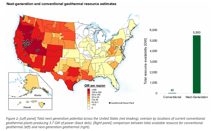 Next generation geothermal technologies could expand geothermal resource potential to 5,500 GW. Remember that conventional geothermal resources are around 40GW. And while this potential is mainly concentrated along the west and south coasts (the red area), there is still a lot of resource elsewhere.