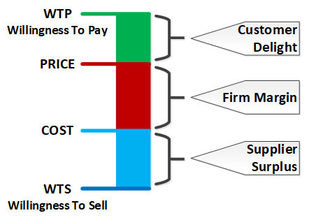 Willingness to Pay is what your customer was 'prepared' to pay for the good or service. And Willingness to Sell is the lowest price your suppliers would have been willing to accept. If we add in the cost and the price charged, we can divide the available 'pie' into what the customer gets, the company's 'profit', and the benefit to your supplier.