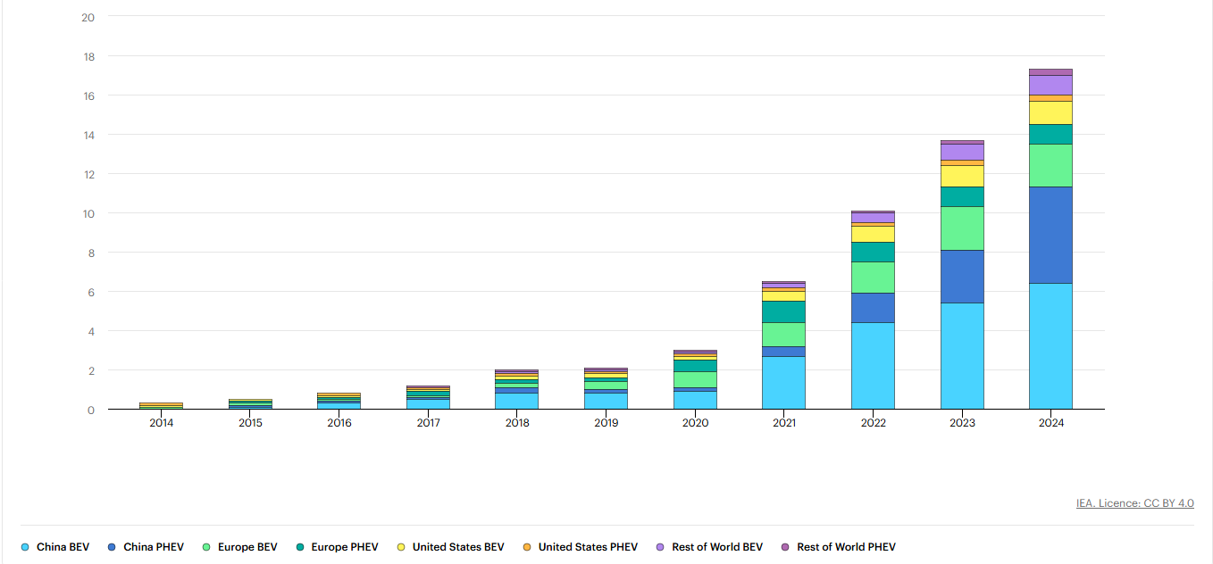 According to the IEA "at the end of 2024, the electric car fleet had reached almost 58 million, about 4% of the total passenger car fleet and more than triple the total electric car fleet in 2021."
