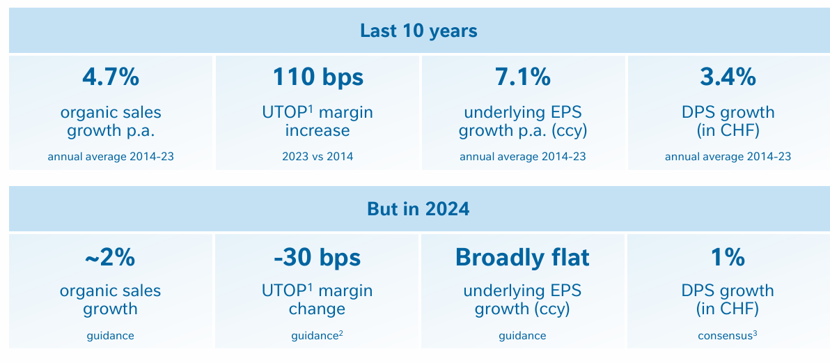 To understand what has driven the historic share price growth we need to start with what became known as the 'Nestle model'. In simple terms this was 4-5% sales growth, and a small annual uptick in operating margins, leading to high single digit earnings/profit growth. This all took place against a food market that was growing at c. 2-3% pa.