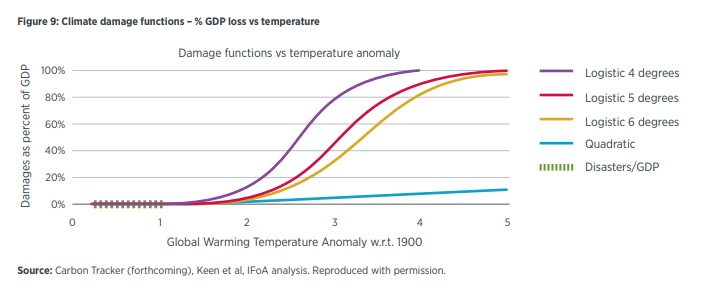 Nothing illustrates this better than the mismatch between the science of climate change, and the economics of the impact of climate change on financial and economic metrics, especially Gross Domestic Product (GDP). The economic climate damage function models that estimate this might sit quietly in the background, but they are powerful, influencing the investment actions of insurance companies, pension funds and banks. And indirectly the actions of companies and politicians.