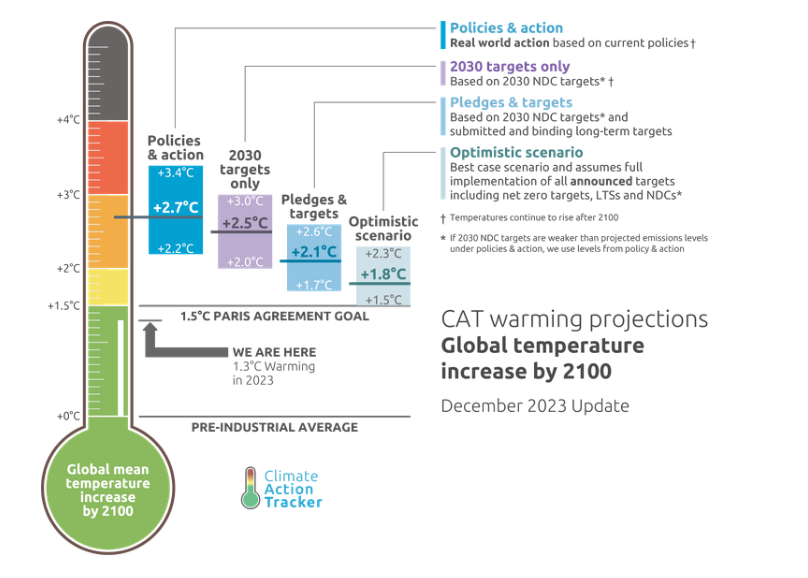 As a reminder, the latest Carbon Action Tracker 'thermometer', has us on a track that could deliver anywhere between 2.2 degrees and 3.4 degrees of warming (the Policies and Actions scenario).