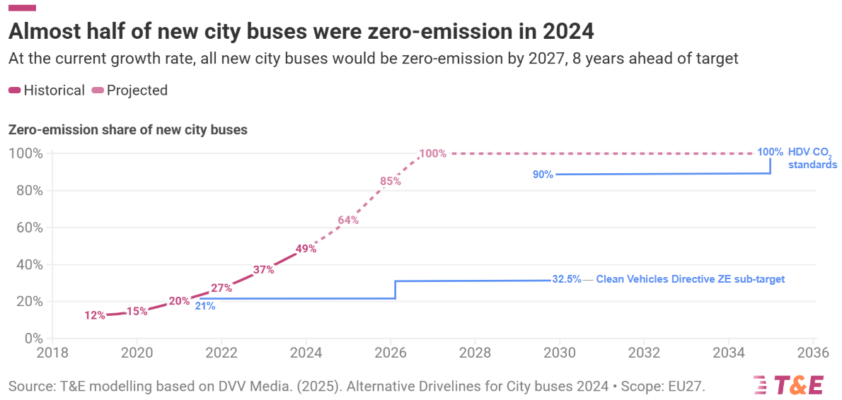 I was reminded of this when I read a recent blog from T&E on zero emission buses in Europe. It wasn't that long ago that these were a rarity, making up less than 1/10 of new sales. And many analysts expected them to remain at a low market share for many years. And yet, as of 2024 that number is now just a whisper below half (49%), with most of these being electric.