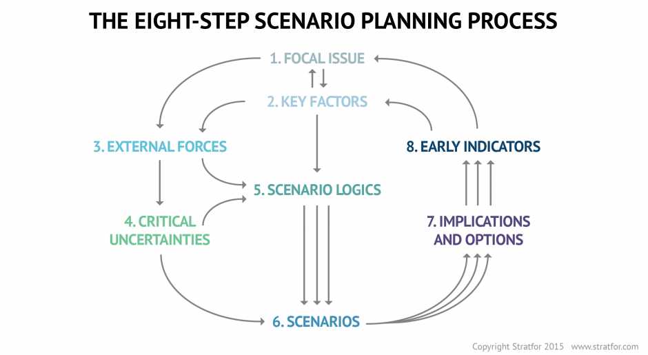 Many company strategies start with scenarios. As Jay Ogilvy stated in his 2015 Forbes article on scenarios and strategy, " each scenario should contain enough detail to assess the likelihood of success or failure of different strategic options".