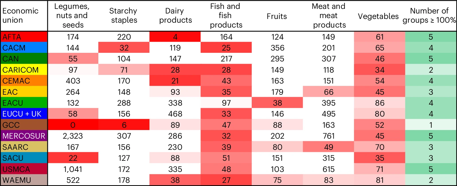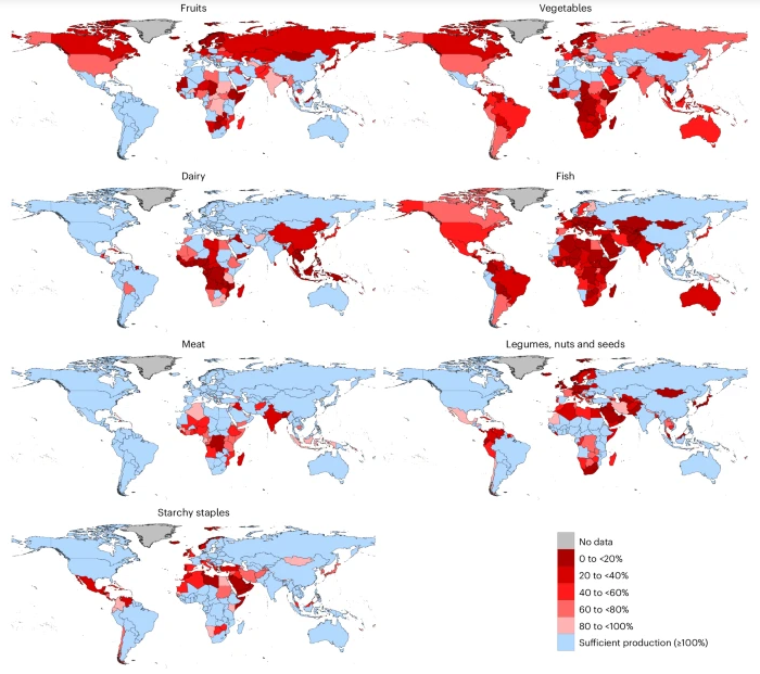 I recently came across a really interesting graphic in Visual Capitalist. Using data from a study published in Nature Food, it shows which countries are self sufficient in the seven essential food groups (starchy staples, fruits, vegetables, dairy, meat, fish, and legumes/nuts/seeds).