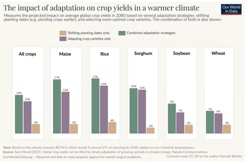 This is a topic that Hannah Ritchie at Our World in Data looked at back in 2024. In a three part series she examined the impact of climate change on food production so far, what we might expect in the future, and things we can do to adapt. It's this third instalment I want to include today.
