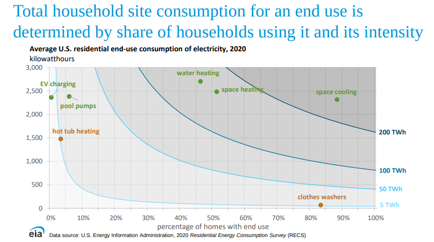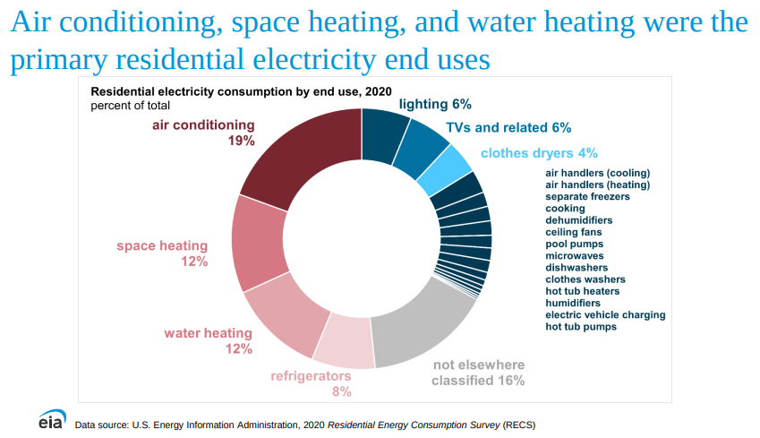 She dives into data from the Residential Energy Consumption Survey (RECS) conducted by the Energy Information Administration (EIA) in 2020 and finds that the majority of electricity usage is about either heating or cooling: space heating, air conditioning, water heating, (de)humidifiers and refrigeration.