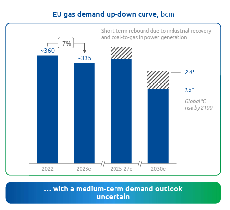 But a material part of the analysis also looks at what happens next. How do the companies respond to the expected decline in demand for natural gas? Sticking with the Italian examples - "Snam & Terna scenarios are for a fall in gas demand in Italy from 62 bcm in 2023 to 53-64 bcm by 2030 and 46-58 bcm by 2040". And as the chart below shows, this is an issue of concern across Europe.